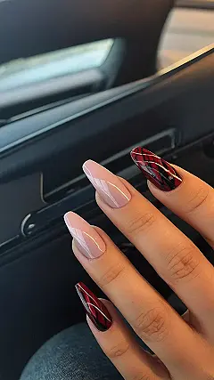 These nails are giving us major “main character” vibes! The simple nude tones with the diagonal accent on some nails is super classy. The red and black plaid design on the others is like, “Yeah, I’m sophisticated, but I also know how to have fun!” Imagine all the cute outfits you could rock with these—totally Insta-worthy, right?