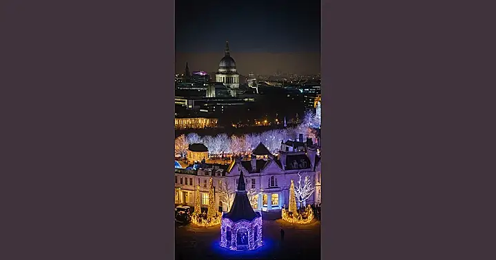 Imagine London at Christmas, but instead of just twinkling lights, picture a whole city glowing like a giant, sparkly Christmas ornament! That’s what it looks like in this picture – St. Paul’s Cathedral watches over the festivities from afar, all majestic and calm, while below, a charming little gazebo is decked out in dazzling purple lights, as bright as a fairy’s Christmas wish come true. It’s surrounded by trees looking like they’ve been dipped in fairy dust, and the whole scene is so unbelievably festive you’d swear Santa himself just landed a sleigh-full of glitter.