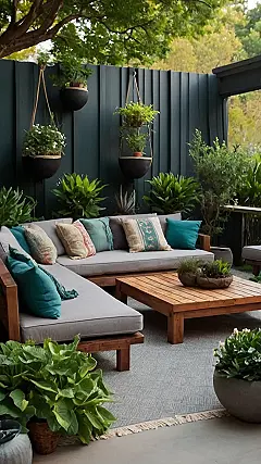 This little backyard totally proves that size isn’t everything. It’s all about maximizing what you’ve got. Notice how they used vertical space with plants on the walls and pergola? Brilliant! Plus, the cool tones of the cushions and the warm wood accents create a super inviting vibe. It’s like a Pinterest board exploded, but in the best possible way. Now, who’s bringing the snacks?