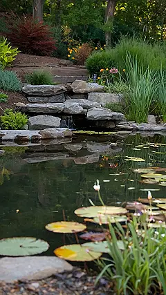 Imagine this: you’re a tiny frog, hopping from lily pad to lily pad in a sparkling pond. The water’s so clear you can almost see your reflection, and colorful lily pads float lazily on the surface. This isn’t just any pond, though – it’s a mini-waterfall paradise! A cute little cascade tumbles down mossy rocks, creating a soothing sound that’s perfect for a peaceful afternoon. It’s like having your own private, ridiculously charming house pond, complete with a small garden bursting with green plants. Who needs a giant swimming pool when you’ve got this?