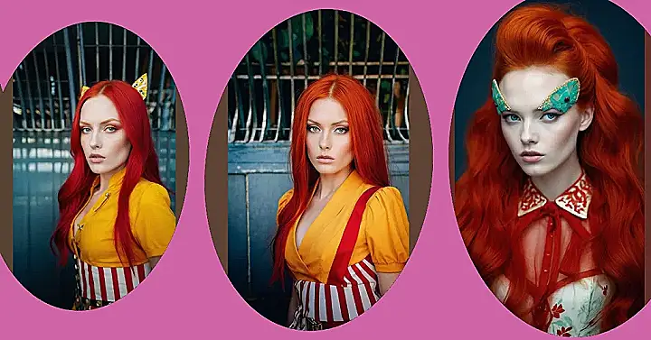 This girl’s got a head full of fiery red hair and a wardrobe that matches! It’s like she took the color red and said, “Let’s make this outfit pop!” The bright yellow and red stripes are super eye-catching, kind of like a delicious candy cane. You can’t help but notice her, and she seems to be rocking it with total confidence. It’s like she’s saying, “Hey world, look at my awesome hair and awesome outfit!”