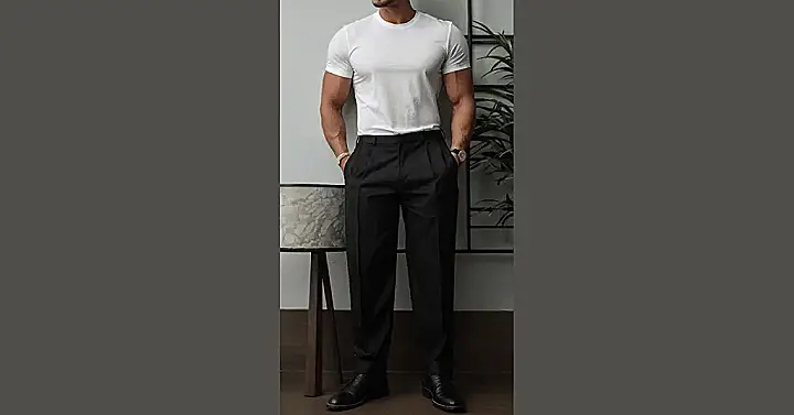 The image shows a guy rocking a timeless outfit that screams “classic.” He’s got on a crisp white t-shirt and sleek black pants. It’s a look that’s clean, sophisticated, and never goes out of style. Think about it: you could put this guy in a time machine and he’d fit right in, whether it’s the 50s, 80s, or even today. And the best part? You probably already have these pieces in your closet.