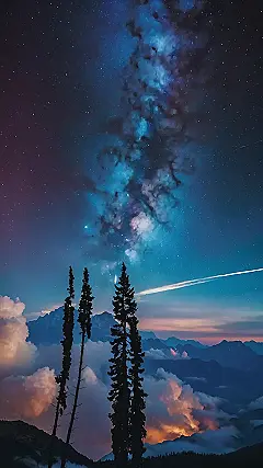This picture is like something straight out of a magical anime! Imagine a scene where the main character is about to embark on a super important quest under a sky bursting with colors and stars, like a giant, sparkly paint explosion. Those lonely-looking trees? They’re probably guarding some ancient secret, maybe a portal to another dimension or a hidden stash of delicious ramen. It’s the perfect blend of peaceful nature and epic adventure, a total mood booster.