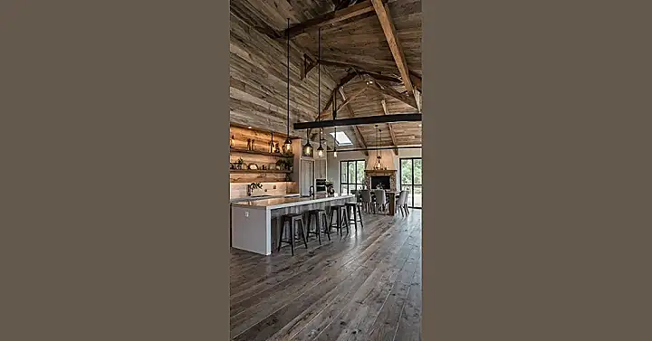 Picture this: you walk into your very own small barndominium, and BAM! The ceiling is so high, you could probably practice your basketball shots indoors (maybe don’t try that). It’s got that cool barn vibe with the metal roof inside, but it’s all cozy home, no dusty hay. This place is like the superhero of small spaces, looking huge and awesome with that massive island table perfect for epic pizza nights or just spreading out your homework (okay, maybe mostly pizza).