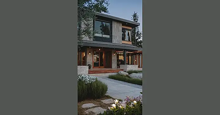 This house is like a total dream! You’ve got the super cool modern design with all the sleek lines, but then there’s also a touch of nature with the stone and the trees. It looks like the perfect place to have a chill summer evening with friends, maybe roast marshmallows on a fire pit (if you can’t tell, I’m totally craving s’mores right now!).