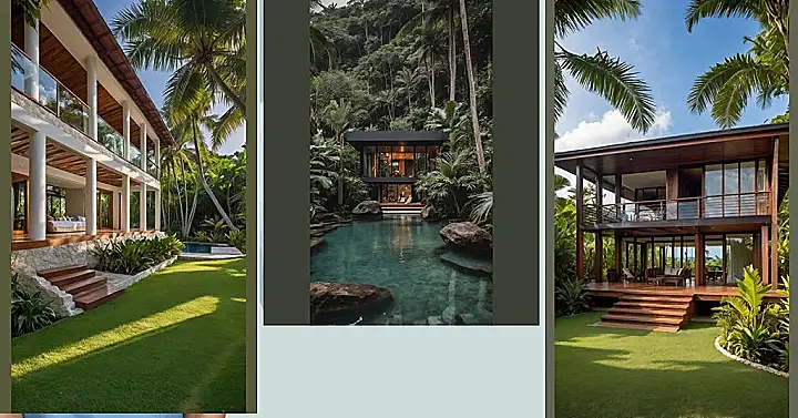 Looking at this place is like seeing a glitch in the matrix, but a really cool one. It’s got this super slick, modern house with all the glass walls, sitting right smack in the middle of a jungle that looks like it hasn’t seen a barber since forever. You half expect a friendly monkey to wave from a tree or maybe even accidentally bonk a coconut off the roof. It’s totally wild nature meets fancy architecture, making you wonder if the designers had to politely ask the palm trees to scoot over a bit.