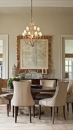 So, your dining room needs a glow-up? Looking at this picture, it’s clear this isn’t your average pizza-night-with-the-family kind of space. That chandelier looks like it’s trying out for a role in a fairytale, and the giant picture frame is basically screaming, “I’m important!”. You might need to start serving dinner with a butler after you re-create this look, or at least practice your pinky-up game when drinking water.