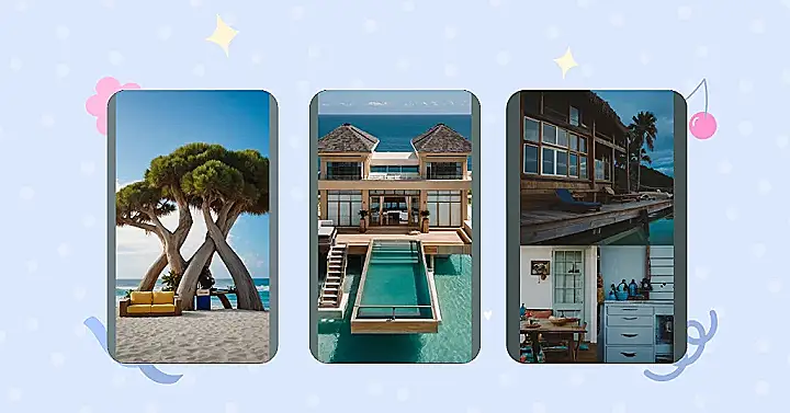 The picture shows a super chill beach house with a pool that looks like it’s calling your name. Imagine waking up, grabbing your swimsuit, and jumping right in! The comfy lounge chairs make it perfect for just relaxing and soaking up the sun, while the little house in the back is the perfect spot for escaping the heat and taking a nap. It’s the kind of place where you could hang out with friends, read a book, or just chill out and enjoy the ocean breeze.