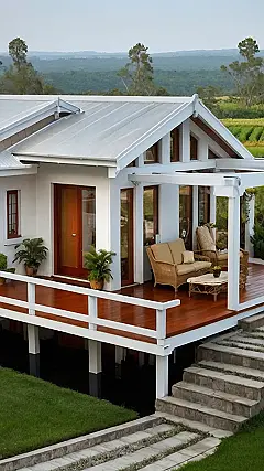 This picture basically screams “peace out” to stress. I mean, just look at that house! It’s like the architectural equivalent of a chill pill. You could totally see yourself rocking in that chair, sipping iced tea, and watching the sunset instead of, you know, cramming for that history test you totally forgot about. The only thing missing is a hammock strung between those trees and maybe a personal chef to bring you snacks every hour.