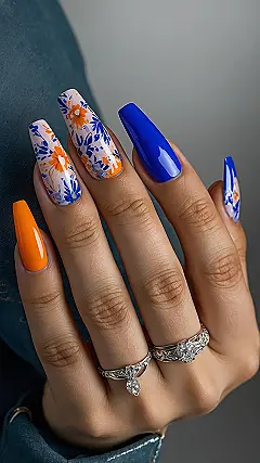 But wait, there’s more! They didn’t just stop at solid blue, they threw in some cool patterns and even a pop of orange like a tiny, cheerful sunset on your pinky. Mixing the solid blue with those flowery nails makes it look like a whole little art gallery is happening on your hand. It’s like your nails are saying, “We can be classy and matchy-matchy, or we can just have fun and wear whatever feels right today!”