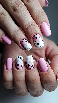 It’s the perfect blend of simple and stylish. You could totally rock these to a holiday party or just to chill with friends. No complicated designs or fancy tools needed – just a dash of pink, a sprinkle of black dots, and BAM! Instant nail envy. Seriously, who needs snowflakes when you can have these sweet little polka dots?