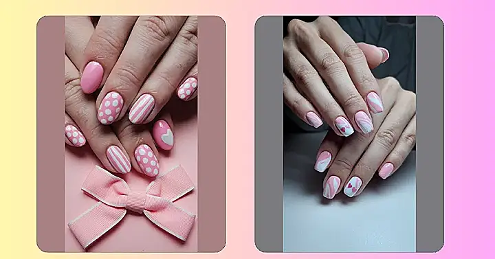These nails are like a pink party on your fingertips! Imagine tiny polka dots and stripes snuggling up together, all dressed in pretty pink and white. It’s like a winter wonderland, but instead of snowflakes, you’ve got adorable nail art. They’re so cute, they’d make even the grumpiest snowman crack a smile. Plus, they’re super easy to do—perfect for a quick manicure even when you’re busy with homework or hanging out with friends.