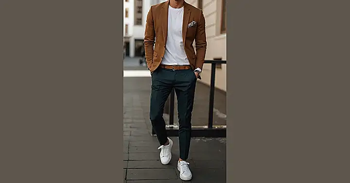 Check out those white sneakers with a jacket like that! Pairing comfy kicks with something a bit more formal is basically the signature move of smart casual style. It tells everyone you clean up well, but you’re also down-to-earth and probably wouldn’t judge them for wearing sweatpants (even though you look way better). Notice how his pants are slightly rolled up too? Little details like that make the outfit look less stuffy and more chill. It’s all about looking sharp but still feeling relaxed, like you just threw it on without thinking too hard (even if you totally did).