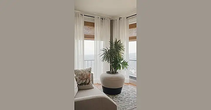This living room is giving off serious “Netflix and chill” vibes. Those curtains are so flowy and light, like a gentle breeze whispering secrets. They’re perfect for blocking out the harsh sunlight and creating a cozy atmosphere, but they’re also super chic! It’s like having a little cloud in your living room, but instead of raining, it’s just making your space look amazing.