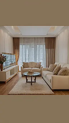 This living room is like stepping into a cozy cloud. The fluffy white sofa looks so inviting, you might just want to curl up and take a nap right there! It’s got all the makings of a perfect hangout spot – a big TV for movie nights, comfy pillows for snuggling, and a super soft rug to sink your toes into. It’s the kind of place you can imagine yourself spending hours with friends and family, laughing and chatting over a good movie. And with that big window, you can soak up the sunshine while you relax.