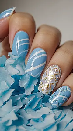 These nails are seriously dreamy! Imagine strolling through a field of pastel blue flowers (like those gorgeous hydrangeas!), and BAM! Your nails match the scene perfectly. The soft blue and white stripes are like a cool breeze on a summer day, and that one nail with the gold accents? It’s like a little sunshine sneaking through the clouds. Totally “soft winter nails” vibes, but with a spring-like twist that’s totally Instagram-worthy.