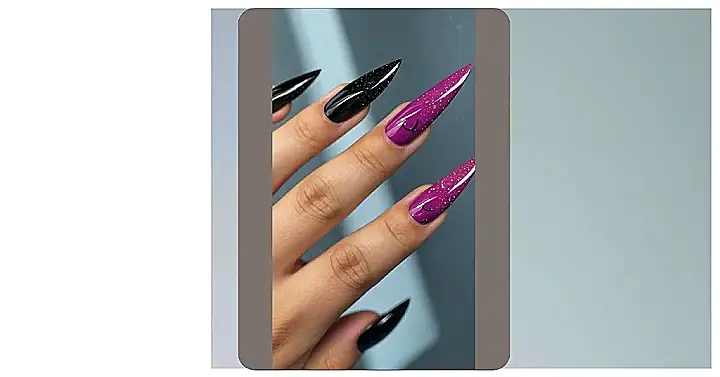 These nails are seriously spooky! They’re long and pointy like a witch’s hat, and they’re decorated with glittery black and purple polish. They might make you think of vampires or maybe even zombies! The little black swirls on the purple nails kind of look like a bat flying through the night, don’t they? Imagine how cool these nails would look with a cute Halloween costume! You’d be the coolest ghoul in the whole school!