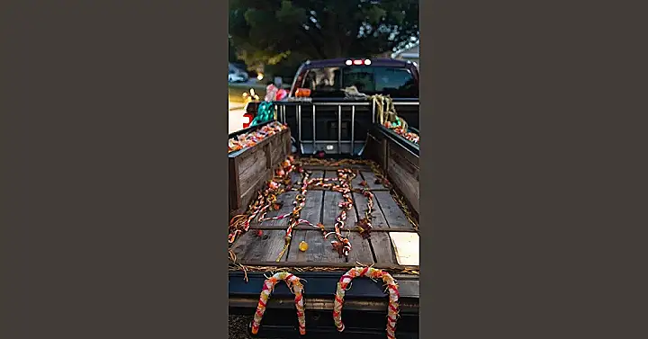 This truck bed is ready to party! It’s decked out with candy canes (so many candy canes!) and even a few festive leaves for good measure. Just imagine all the little ghosts and goblins who will be thrilled to get a treat from this spooky sweet setup. Maybe you could add a spooky banner, some cobwebs, or even a friendly monster to really give your truck bed a Halloween vibe!