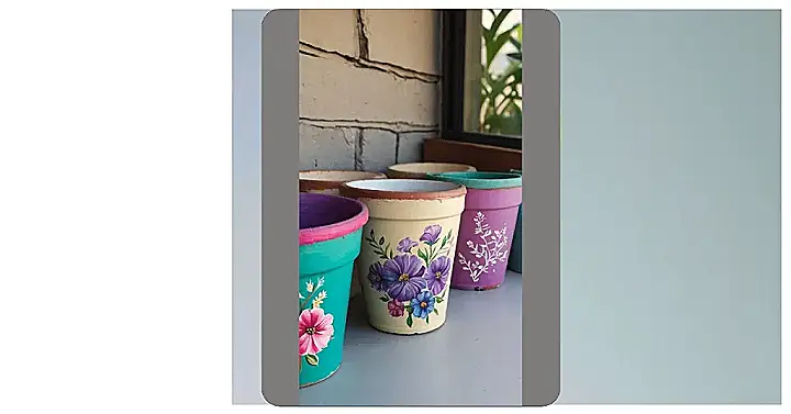 So, you’ve got these flower pots, right? But they aren’t just plain old boring brown. Someone went wild with the paint and turned them into a mini-garden party! It’s like each pot is screaming, “Look at me! I’m more than just dirt storage; I’m a masterpiece!”. They remind me of a super cool art project, maybe even cooler than that tie-dye shirt you made in summer camp.
