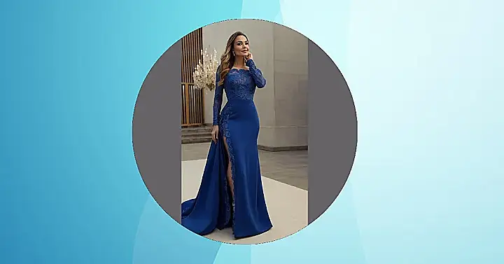 Imagine showing up to a spring dinner looking like you just stepped out of a fairytale! This dress is giving major Cinderella-goes-to-prom vibes, but way more grown-up. The color is like a fancy sapphire, and all that lace detail? It’s like a garden party exploded onto the fabric. Just try not to trip over the train when you’re accepting your award for “Best Dressed.”