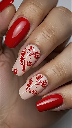 Look at these nails showing up like the first brave flowers of spring! That bright, cherry red is basically sunshine on your fingertips, totally ready to ditch those gloomy winter vibes. The little sparkly leaf or flower designs are like tiny secret gardens blooming right there, giving a fancy touch without being stuffy. They practically make you want to skip down the sidewalk, just to show off how cheerful your hands are! It’s like your nails got the memo that spring is here and decided to throw a tiny, fabulous party.
