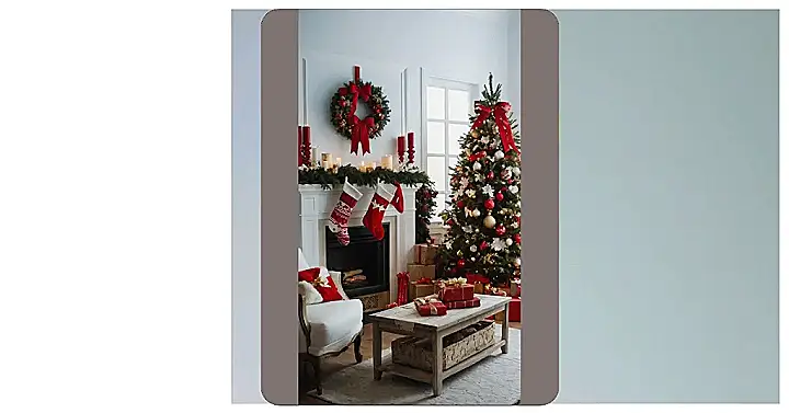 This Christmas scene is seriously festive! Look at that gorgeous tree, all decked out in shimmering ornaments and big, bold red bows. It’s like a Christmas explosion of red and white, and the stockings hanging by the fireplace are just the cherry on top (or should we say, the candy cane?). It’s the kind of Xmas decorations that make you want to grab a mug of hot cocoa and snuggle up by the fire with a good book.