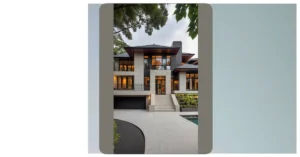 Living here would be pretty awesome; you could pretend you’re hosting world leaders, but really you’re just trying to convince your parents to let you stay up late. Those cool black doors look super grand, perfect for making a dramatic entrance when you finally finish your homework. And check out the little pointy trees guarding the entrance, they probably just want to look important, standing there like miniature sentinels ready to… maybe look pretty for photos? It’s definitely a house that looks like it has secrets, but probably just where the good snacks are hidden.