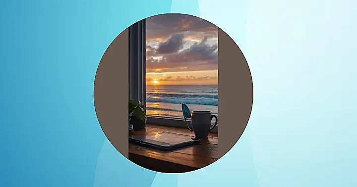 This picture is like a postcard from a chill vacation! Imagine waking up to this amazing view – the sun peeking through the clouds, painting the sky in beautiful colors, and the ocean looking like a giant, shimmering pool. You could sit by the window with a warm cup of coffee and watch the sunrise, maybe even with a tablet in hand to catch up on your favorite show or browse the internet. Who needs a fancy alarm clock when you have this view to wake up to?