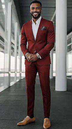 This guy’s rocking a seriously stylish men’s red suit! It’s like a superhero costume, but instead of fighting crime, he’s probably fighting off compliments. The deep red colour is awesome, and the way it’s paired with a black shirt and those snazzy brown shoes is total class. He’s basically a walking advertisement for looking good, and honestly, who wouldn’t want to look this dapper? Imagine all the cool parties and events you could attend looking this sharp; he’s ready for anything – from a fancy dinner to a superhero convention (though maybe not a pool party!).