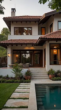 Check out this ranch house exterior, looking all cozy and inviting like it’s giving you a friendly wave. Forget those huge, fancy houses that look like they’re trying too hard; this place has laid-back style down pat. It’s got that cool, low-slung shape perfect for blending into the scenery, not shouting for attention. The clean white walls and that warm, reddish roof tile totally make you want to walk right up that stone path, maybe expecting a pitcher of lemonade on the porch.