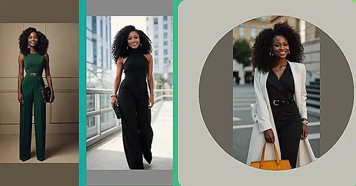 This image is all kinds of fabulous! Just look at this stunning black jumpsuit— it’s like the ultimate “black lady outfits” goal. It’s sleek, chic, and makes this model look like she’s ready to take on the world (or at least, a seriously awesome party). The cut is super flattering, and that hair? Don’t even get me started! The whole look screams confidence and style—who needs a tiara when you’ve got that much swagger?