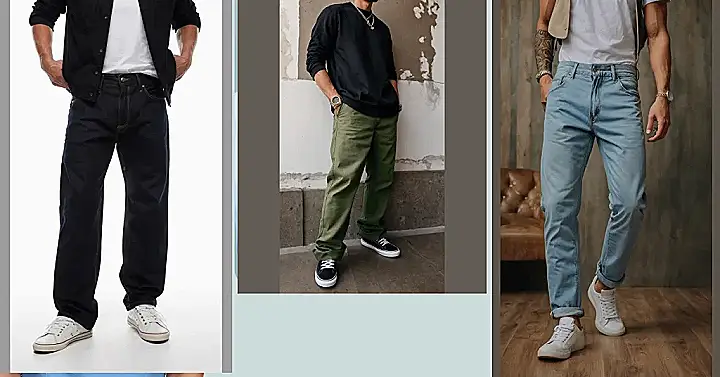 See how they pair them with just a simple tee and shirt? That’s the magic of good men’s streetwear jeans. They take basic stuff and make it look instantly awesome. Add some fresh kicks like the white ones shown, and bam! You’ve got an outfit ready for anything, from crushing it at school to just, well, crushing snacks on the couch. These aren’t just pants; they’re your ticket to comfy, cool vibes.