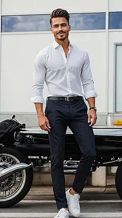 Check out this dude! He’s rocking a simple shirt, slick trousers, and clean white sneakers. It’s the kind of look that says, “Yeah, I put zero effort into looking amazing.” Except, you know, he totally did. But seriously, it’s smart, it’s casual, and it looks super comfy. Plus, that little ankle roll on the pants and the cool shades? Chef’s kiss! It just proves you don’t need wild colours or crazy patterns to stand out and look put-together, even if you’re just leaning against a wall looking cool.