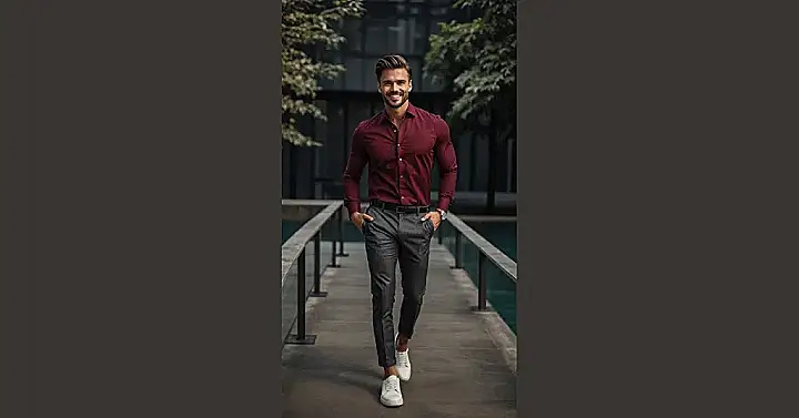 Looking at this dude’s outfit is like finding a secret level in a video game. He’s rocking a sharp burgundy shirt and grey pants, looking all professional and stuff, like he’s about to give a TED talk on quantum physics. But then you peek down, and bam! Fresh white sneakers! It’s the ultimate proof that you can totally look dressed up without feeling like you’re trapped in a fancy suit that smells like mothballs. It’s formal-ish fashion that lets you keep your feet happy and ready for, well, anything that isn’t actual running.
