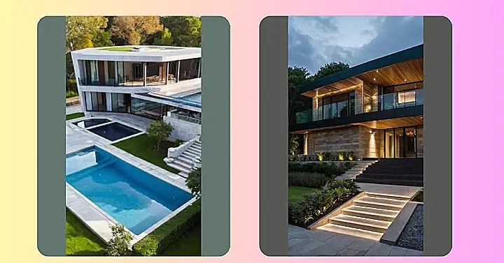 This house isn’t your grandma’s mansion! It’s got sleek lines and a super modern design, but with a calming Zen vibe. Imagine chilling on that balcony, sipping lemonade, and watching the sunset. The little pool in the front looks super relaxing – maybe you could even do some yoga in the morning while the rest of the house is still asleep. This place is definitely a “wow” factor for sure!