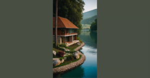 This house is so fancy, it even has its own little pond! It looks like a perfect place to chill out and forget about all your worries. Imagine yourself relaxing by the pond, watching the sun set and listening to the birds chirping. The house has a big green door, which is pretty cool. I wonder what’s behind it, maybe a super secret room with a hidden treasure? Or maybe just a big, fancy kitchen that smells like cookies. Either way, this house is definitely a dream come true!