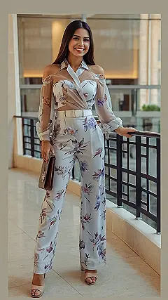 This outfit is giving us major European vibes! It’s all about the flowy fabrics and the dainty details. The loose-fitting pants and the sheer, floral-print blouse are perfect for a breezy autumn day, and the subtle peek of skin at the shoulders adds a touch of chicness. Plus, the cute little purse and the heels just scream “I’m ready to stroll through the streets of Paris!”
