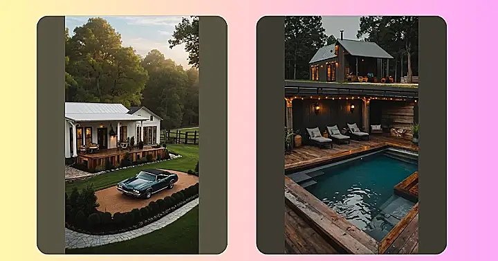 This picture shows a seriously cool barndominium—it’s like a barn and a mansion had a super stylish baby! Imagine: you’ve got your own cozy, compact home, all decked out with fairy lights, and then BAM! You walk outside to your own private pool. It’s the perfect blend of rustic charm and modern luxury, and honestly, who wouldn’t want to spend their summer chilling by that gorgeous pool? It’s so compact that you get the cozy vibe without having to clean a huge house all day.