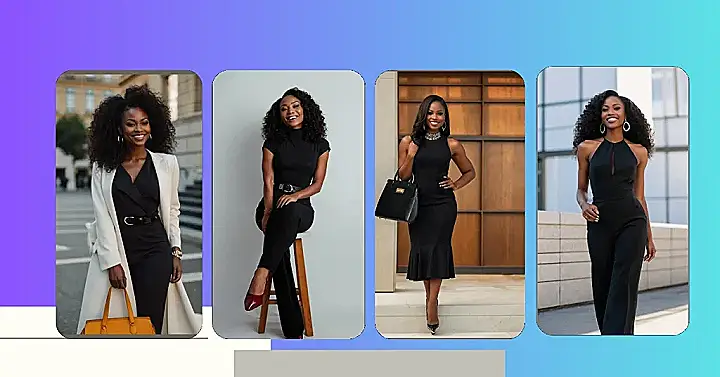 This image is all kinds of fabulous! Just look at this stunning black jumpsuit— it’s like the ultimate “black lady outfits” goal. It’s sleek, chic, and makes this model look like she’s ready to take on the world (or at least, a seriously awesome party). The cut is super flattering, and that hair? Don’t even get me started! The whole look screams confidence and style—who needs a tiara when you’ve got that much swagger?