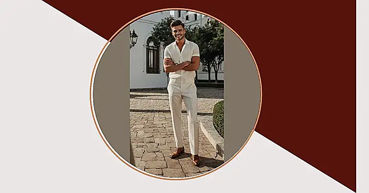 Taking a cue from this dapper dude, dressing smart for the heat is all about choosing the right stuff. Notice how he’s rocking light colors – cream or light beige is a total lifesaver because dark colors just trap heat like crazy. And check out that shirt! It’s short-sleeved but still looks sharp because it’s tucked in and paired with matching pants and a vest. This outfit is the perfect blend of formal enough for a wedding but breezy enough that you won’t feel like you need to jump in the nearest fountain. It proves you can look sharp and stay comfortable, even when the sun is trying its best to melt everyone.