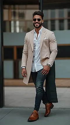This guy’s got wedding guest style down pat! Forget the stuffy tux; he’s rocking a super cool, relaxed look that’s perfect for a modern wedding. Think beige coat that’s way more stylish than a grandpa sweater, a crisp white shirt that says “I made an effort,” and jeans that show he’s not afraid to have a little fun. Brown shoes? Top marks! He’s proving that you can be dapper and comfortable at the same time. This isn’t your average wedding attire, it’s a wedding upgrade.