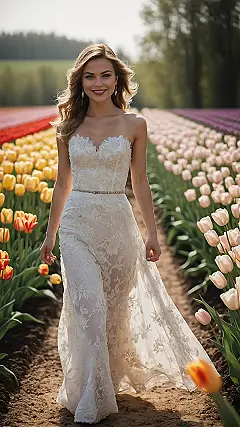Check out this amazing scene! We’ve got rows and rows of gorgeous colorful tulips stretching into the distance. It looks like the perfect place for a photo shoot, right? And then there’s the outfit! This person is rocking a stunning, flowy white dress that looks like it stepped right out of a movie or a fancy party. While it totally looks incredible surrounded by all those flowers, you gotta admit, it’s probably not the first thing you’d grab for a chill day walking through muddy farm rows, unless you’re trying to confuse the bees or something.