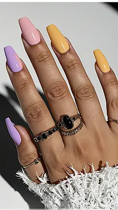 Check out these nails looking like a whole vibe! That soft purple and pink mixing together reminds me of when the sky does its amazing color show right before the sun dips down, finished off with that bright yellow like the last bit of sunshine. They’re basically little sunset masterpieces on fingertips, making you feel like you should be sipping something cool by the water, even if you’re just doing homework. They look so smooth and ready for anything!