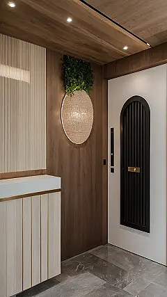 This main entry area looks like it’s ready for a VIP guest every single time the door opens! It’s so fancy, you almost expect a velvet rope and a bouncer standing next to the flower vase, checking your credentials before letting you inside. Walking through this door probably feels less like just getting home and more like making a grand appearance, complete with dramatic lighting from that cool glowing ceiling pattern that looks like it came straight out of a spy movie headquarters.