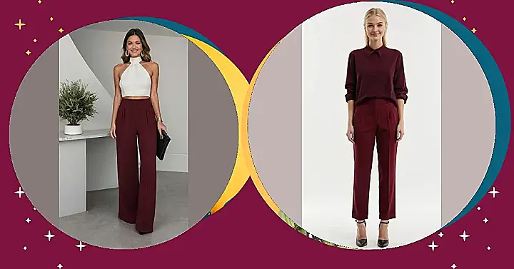 These pants are seriously the bomb! Imagine stepping out in these stylish burgundy trousers – they’re like the perfect blend of sophisticated and sassy. Pair them with a mustard yellow top, like the model is showing off, and bam! You’ve got a look that screams “I’m ready to conquer the world (or at least, ace that history test).” It’s so chic, it might make you want to start a wine-tasting club just to have an excuse to wear this outfit more often!