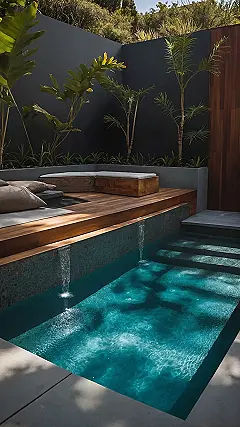 This picture shows off what I’m calling a “tiny pool,” but don’t let the size fool you. It’s more like a super-exclusive VIP lounge for your toes. You’re not exactly doing laps in this thing, unless your laps are really, really short and involve a lot of bumping into the edges. Think of it as a fancy bathtub chilling outside, surrounded by cool wood, concrete, and some serious greenery. It’s perfect for dipping your feet after a long day, or maybe hosting a synchronized swimming team of rubber ducks.