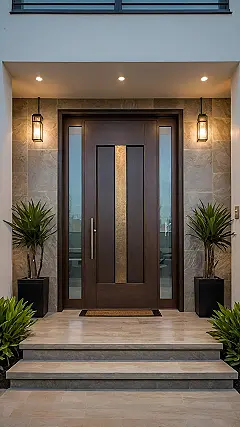 This main entry door in the picture is basically the red carpet of houses, looking all sleek and important with its cool lights and symmetrical plants standing guard. It’s the place where you make your grand arrival or, more likely, frantically pat your pockets searching for keys while trying not to look like you’ve been wrestling a badger. This door isn’t just a way in; it’s the front-line defense against the outside world and the first thing everyone sees, silently wishing you remembered to sweep the porch.