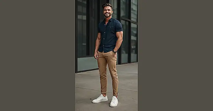 Look at this guy! He’s basically the walking example of how to look sharp without spending hours figuring out what to wear. That’s the magic of Americana men’s style right there. It’s like he just pulled that simple dark shirt, those perfect khaki pants, and crisp white sneakers out of his closet, put them on, and instantly looked like he knows what’s up. It’s not fancy or overcomplicated; it’s just clean, classic, and makes you look ready for anything, whether that’s grabbing pizza or accidentally ending up in a photoshoot.