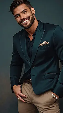 This guy’s outfit is sharper than a detective’s wit! That teal blazer is seriously smooth, like a perfectly poured milkshake. And those khaki pants? They’re the kind of relaxed cool that says “I’m sophisticated, but I also know how to have fun.” He’s rocking the “perfect gentleman” look without looking stuffy – he’s practically a walking, talking example of how to nail that keyword.