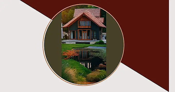 This beautiful house looks like it’s straight out of a fairytale! It’s got a charming wooden roof and those big windows, they look like they’re just waiting for someone to peer in and see what secrets lie inside. But the most magical part? That little pond in front of the house! The water is so still, it’s like a giant mirror reflecting the house perfectly. Maybe it’s even got a little mermaid living in it!